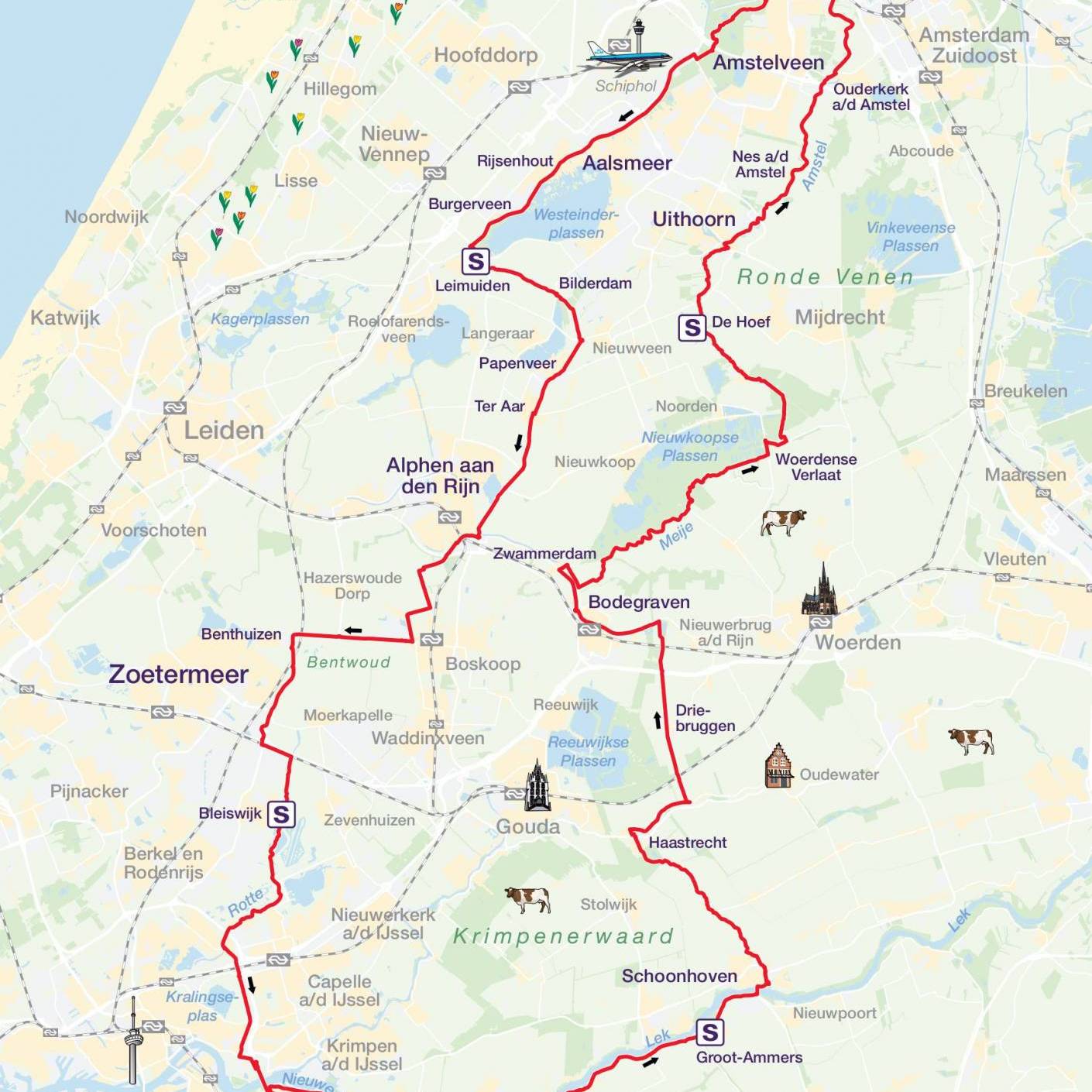 Hoe werkt dit precies? We adviseren je om rond 07.00 uur te starten, dit kan vanaf je eigen voordeur of een plaats bij jou in de buurt. De route is alleen beschikbaar als GPX-file en is dus niet uitgepijld. Onderweg kom je langs unieke highlights zoals de Ringvaart, Rottemeren, Van Brienenoordbrug, Kinderdijk, De Vlist, de Meije en natuurlijk de Amstel. Met diverse horeca gelegenheden langs de route hebben wij afspraken gemaakt zodat jij een heerlijk appeltaartje, pannenkoek, soep én een tosti kunt scoren onderweg. Let op: de IJtunnel is niet opgenomen in de route.