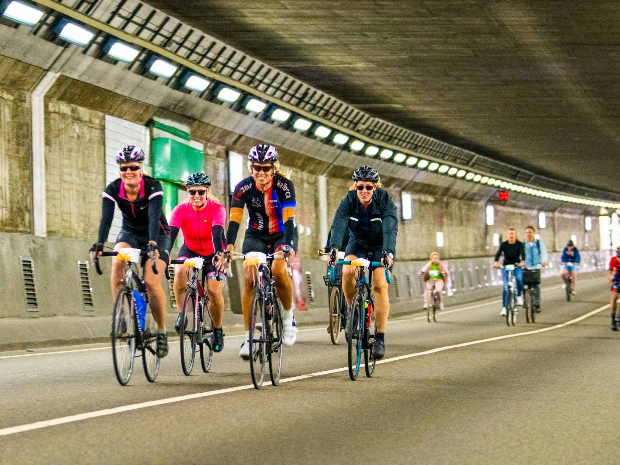 Only once a year, during the Saxo Dam tot Dam FietsClassic, it is possible to cycle through the IJ-tunnel. At this classic cycling event you can choose for 40, 60, 90, 110, 160 and 200 km. You can join the event on your race bike, mountainbike, city bike, hand bike, tandem or any type of bike: everyone can participate!