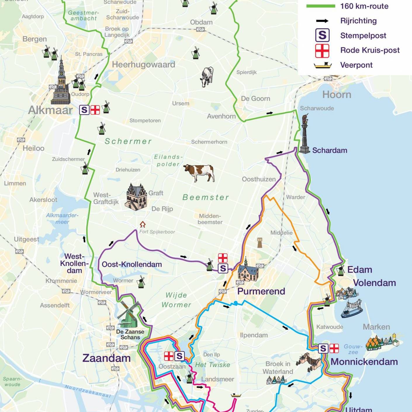 Na Zaandam verlaat deze route het parcours van de 160 km. Door de waterrijke polders van de Wormer fietsen de deelnemers naar de verzorgingspost in Purmerend. De fietsers gaan vervolgens naar Schardam, waar de route weer samenkomt met de 160 km. Na Edam en Volendam volgt de gezellige verzorgingspost in Monnickendam. Via Uitdam en de vernieuwde dijk bij Durgerdam vervolgt de route zich over de Amsterdamse bruggen door de binnenstad terug naar de finish op de Dam.